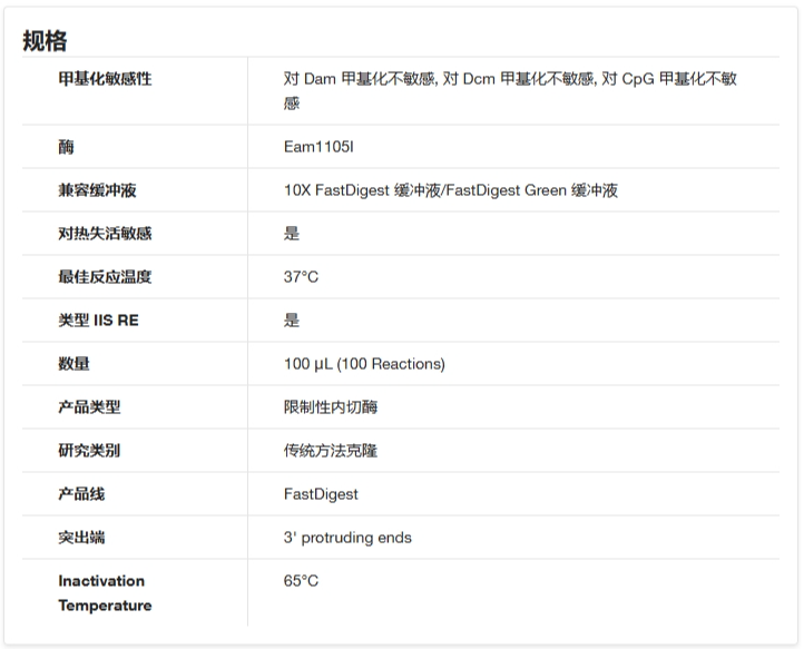Thermo Scientific FastDigest Eam1105I 限制性内切酶可识别 GACNNN^NNGTC 位点,并使用通用 FastDigest 缓冲液于 37°C 下在 5–15 分钟内的切割效果最佳。同裂酶:AhdI、AspEI、BmeRI、DriI、EclHKI。
