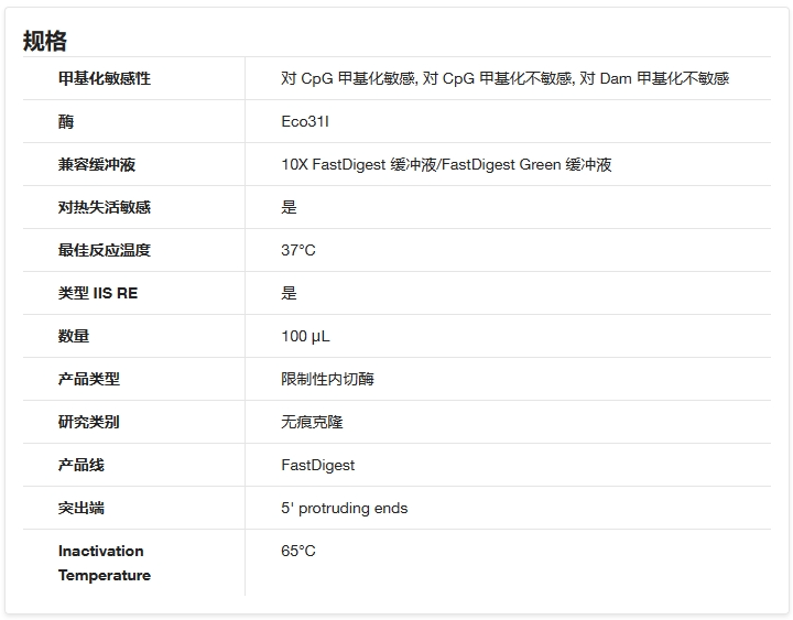 Thermo Scientific FastDigest Eco31I(IIs 型)限制性内切酶可识别 GGTCTC(1/5)^ 位点,于 37°C 下使用通用型 FastDigest 缓冲液在 5–15 分钟内的切割效果最佳。同裂酶:BsaI、Bso31I、BspTNI。