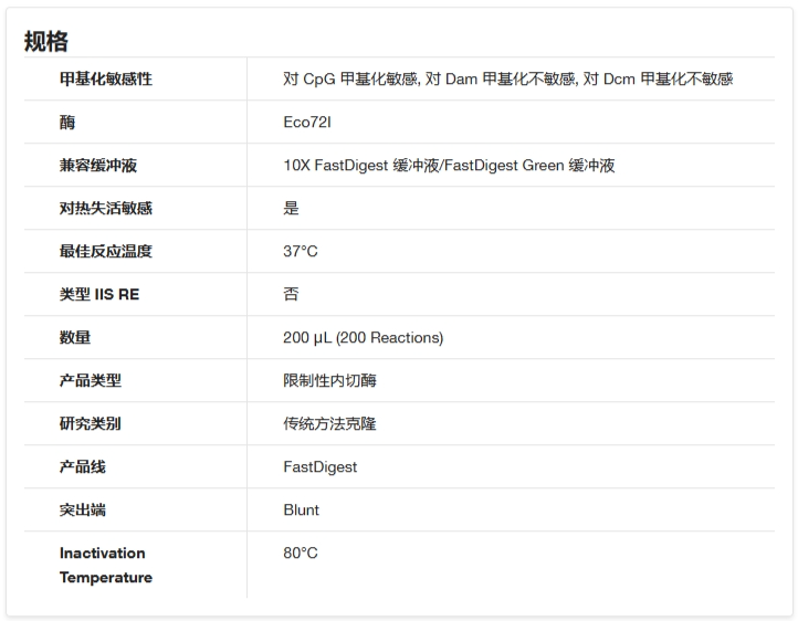 Thermo Scientific FastDigest Eco72I 限制性内切酶可识别 CAC^GTG 位点,并使用通用 FastDigest 缓冲液于 37°C 下在5–15 分钟内的切割效果最佳。同裂酶:PmlI、AcvI、BbrPI、PmaCI、PspCI。