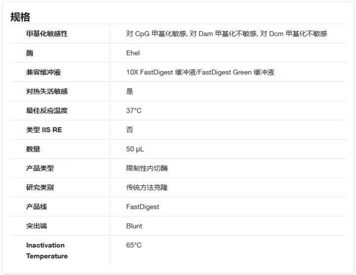 Thermo Scientific FastDigest EheI 是一系列高端快速限制性内切酶之一,该系列在通用型 FastDigest 和 FastDigest 绿色反应缓冲液中均具备 100% 活性。
