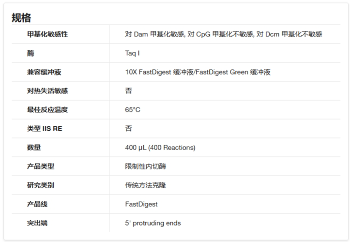 Thermo Scientific FastDigest TaqI 属于快速限制性内切酶的高端系列,该系列在通用型 FastDigest 和 FastDigest 绿色反应缓冲液中均具有 100% 活性。