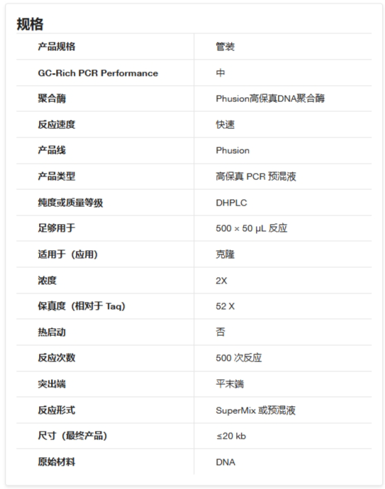 Phusion 高保真 PCR 预混液是方便操作的 2X 混合液,其含有 Phusion DNA 聚合酶、核苷酸以及含 MgCl2 的优化反应缓冲液。提供两种预混液配方 - 含 HF 缓冲液(F-531S 和 F-531L)和含 GC 缓冲液(F-532S 和 F-532L)。HF 缓冲液中的 Phusion DNA 聚合酶的错配率 (4.4 × 10-7) 低于 GC 缓冲液的错配率 (9.5 × 10-7)。因此,应该使用含 HF 缓冲液的预混液作为高保真扩增时的默认预混液。但是,GC 缓冲液可以提高 Phusion DNA 聚合酶对一些复杂模板或长模板的扩增性能,例如富含 GC 的模板或具有复杂二级结构的模板。